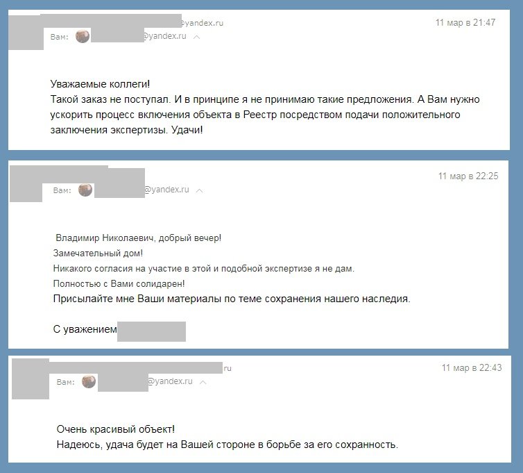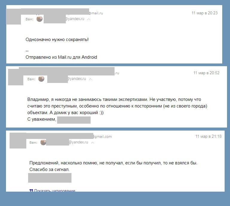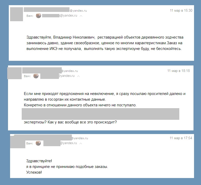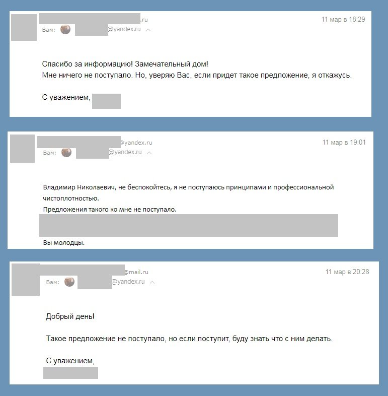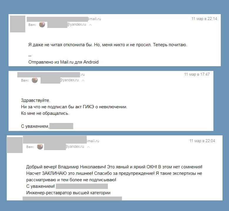 А еще в марте были разослали более 200 писем экспертам по всей России с вопросом, не поступало ли к ним предложение от заинтересованных в отрицательной экспертизе лиц? Подавляющее большинство ответов выглядело именно так, прикладываю.