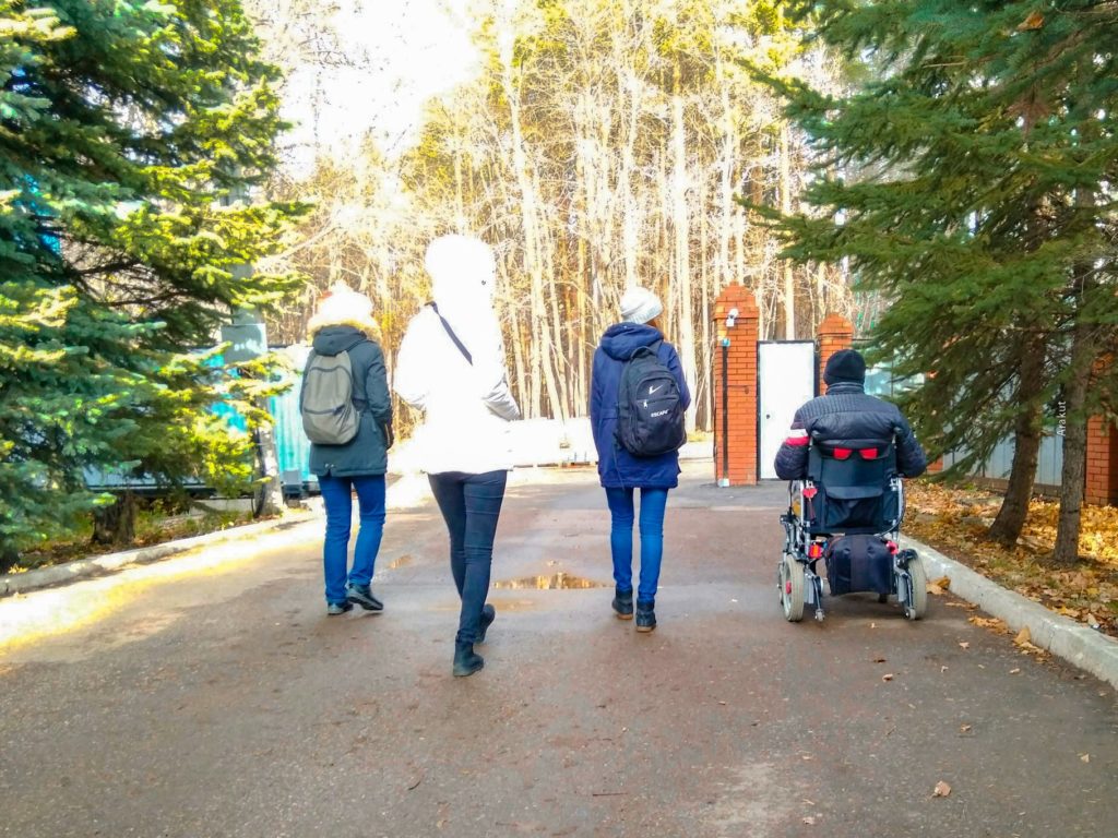 Провожать нас вышел еще один житель дома престарелых. Шутил с девчонками, рассказывал о себе, уверенно катился рядом с идущими.