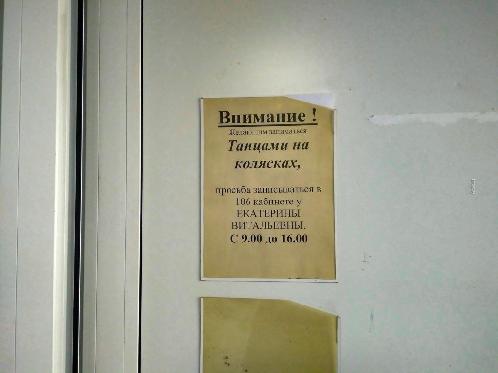 (фото 3) На входе висит вот это объявление и мир уже как будто немного меняется. «Танцы на колясках», хотите попробовать?)