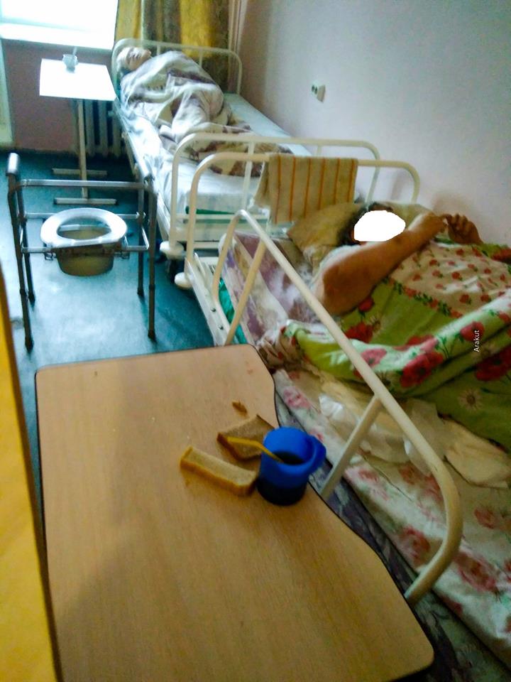 (фото 4,5,6,7) Времени что-то рассматривать почти нет, на часах обед, а значит нужно помогать. Мы ходим по палатам, в каждой из которых размещены по 3-4 человека, чаще всего лежачих, у многих ампутированы некоторые конечности, коляски повсюду. Здороваемся, спрашиваем о настроении, интересуемся, не нужно ли помочь с обедом? В одной из палат женщина просит о помощи.Она лежит на кровати, но совместными усилиями мы мягко поднимаем ее, усаживаем и моя подруга начинает ее кормить. Посреди комнаты стоит утка, вы уже заметили ее? На дальней кровати лежит женщина, которая просит отвести ее в лес, набрать хвороста.