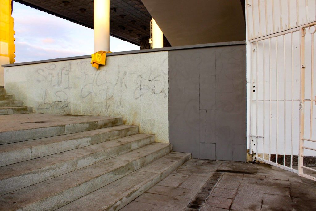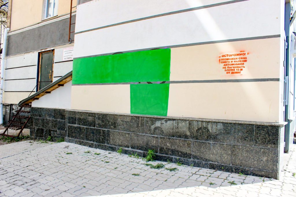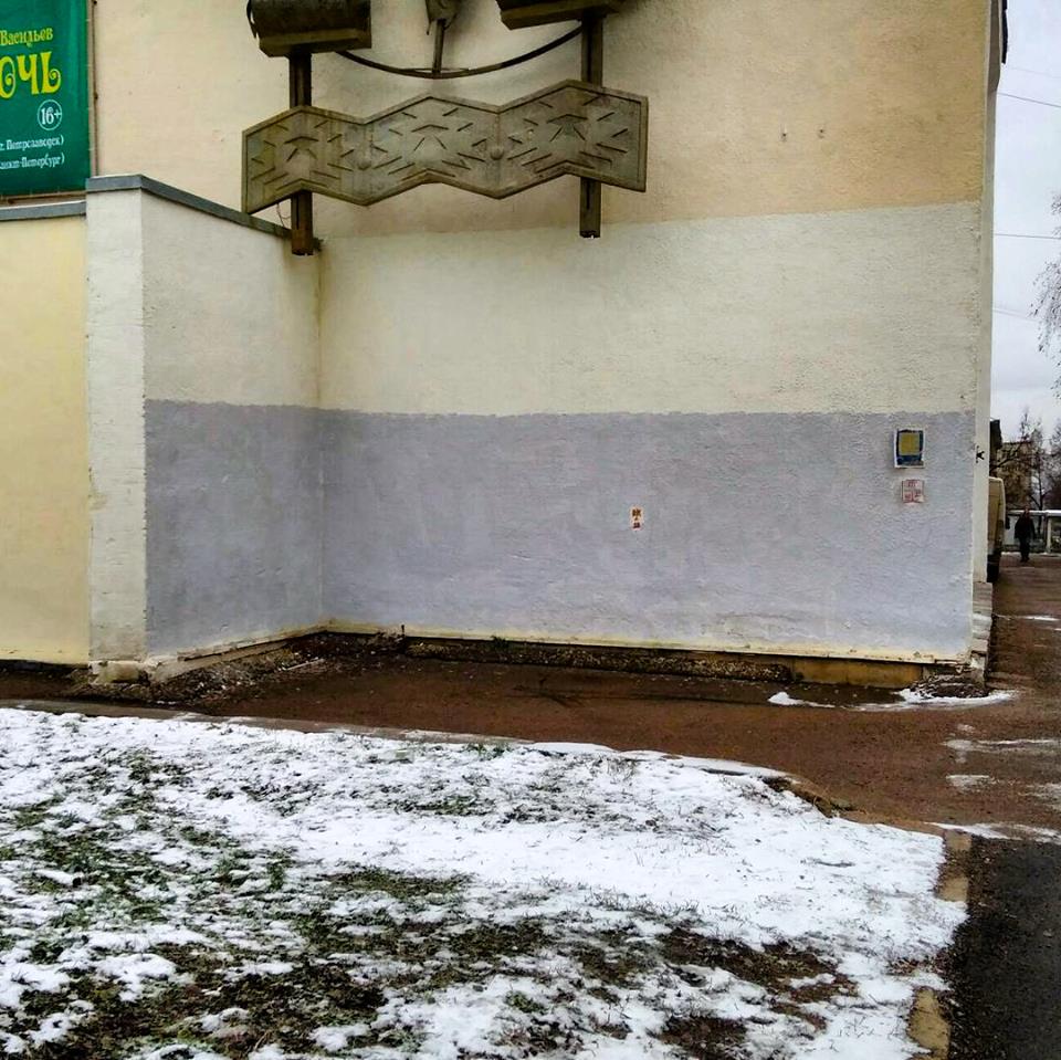 Стена Театра Кукол. Раньше тут было графити, я попросил исправить ситуацию и… исправили. Вот только краску в тон кому-то было лень подбирать. В результате наблюдаем вот такую хрень.