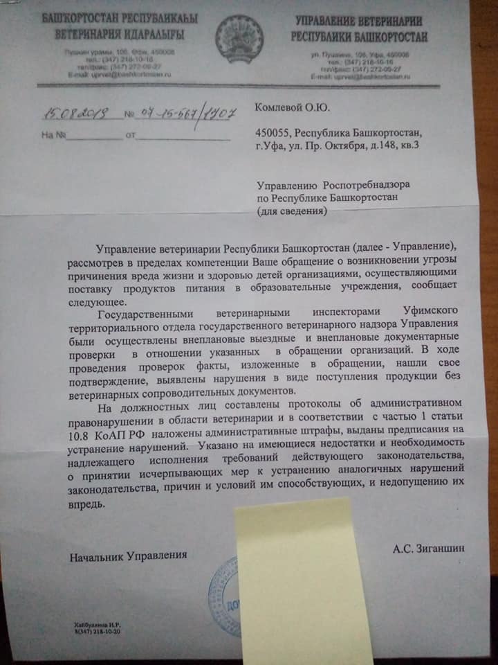 1. Начальник ветеринарной службы Башкортостана Зиганшин подтвердил, что в школы поставлялось мясо без ветеринарных документов. Наложены штрафы и выписаны предписания.