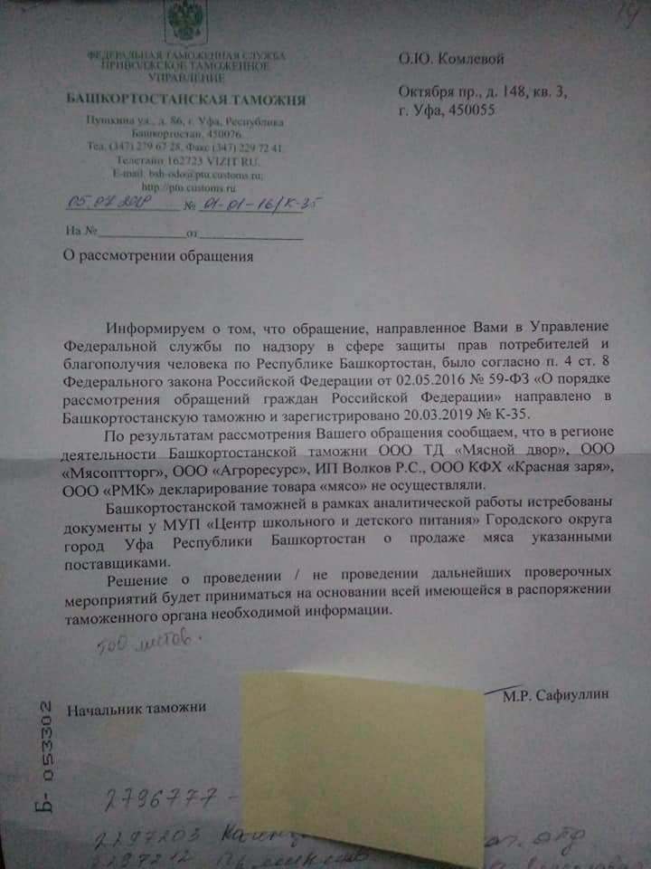 2. Начальник башкирской таможни М.Р. Сафиуллин сообщил, что фирмы, которые поставляют мясо в школы через границу мясо не переправляли. Но таможенной службой отправлен запрос в МУП «Центр школьного и детского питания». То есть проверку вроде как продолжают. На данный момент исполнитель в таможне мне сообщил, что МУП предоставил им около 500 листов информации о поставщиках мяса и что по ним отправлены запросы. И пока на конечного поставщика мяса они не вышли. То есть проведен тендер на поставку мяса. Там победители ООО «ТД Мясной двор», ООО «Мясоптторг», ООО «Агроресурс», ИП Волков, ООО «РМК», ООО «КФХ Красная Заря». Откуда эти конторы получили мясо пока неизвестно.