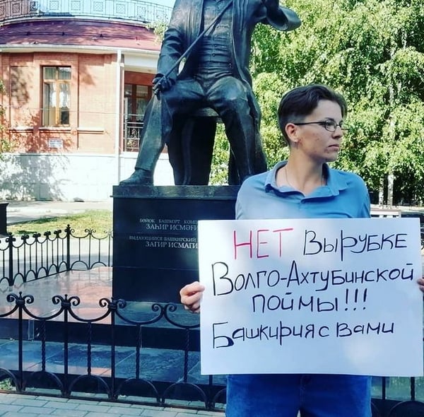 Одиночные пикеты в защиту поймы проходят в разных городах России, в том числе активистка фракции «Зеленая Россия» ahfrwbb Яблоко Башкортостан.