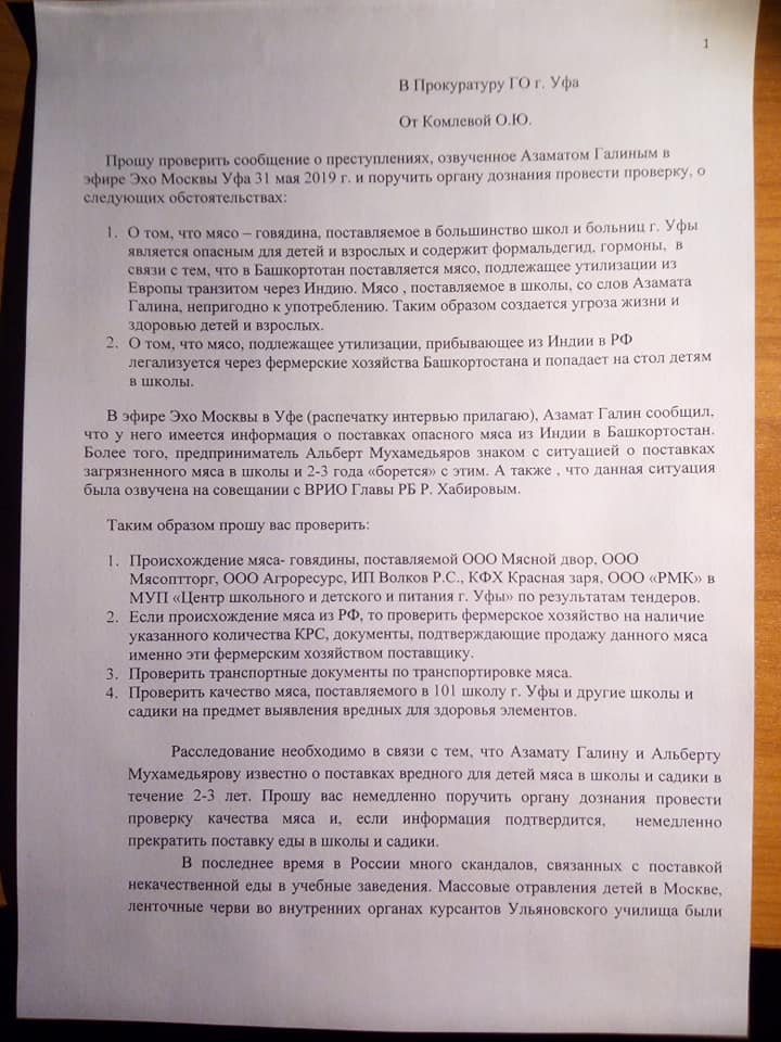 В эфире Эхо Москвы в Уфе (распечатка интервью в первом комментарии), Азамат Галин сообщил, что у него имеется достоверная информация о поставках опасного мяса из Индии в Башкортостан. Что мясо привозится сюда, легализуется и поступает в школы. Более того, предприниматель Альберт Мухамедьяров знаком с ситуацией о поставках загрязненного мяса в школы уже 2-3 года и «борется» с этим. А также , что данная ситуация была озвучена на совещании с ВРИО Главы РБ Р. Хабировым.