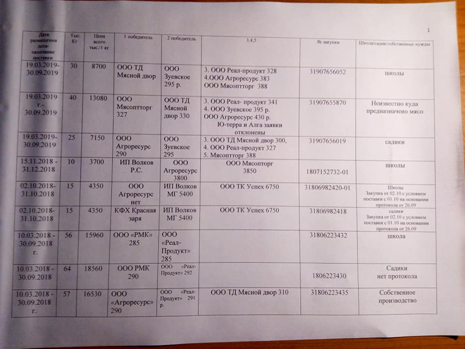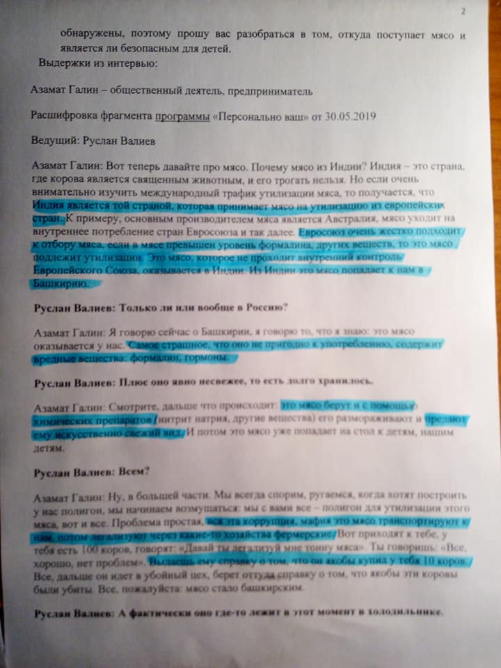 Наконец я обращаюсь к победителям тендеров на поставку мяса в школы: ООО «Агроресурс» директор Александрова Анастасия Сергеевна, ООО «ТД Мясной двор» Муратов Андрей Минисултанович, ООО «Мясоптторг» Лукманов Роман Нагимович, ИП Волков Р.С., КФХ Красная Заря и ООО «РМК»! Ваши имена опозорены Азаматом Галиным. Заявлено, что поставщики мяса поставляют в большинство школ контрабандное, опасное мясо, поэтому прошу Вас предоставить данные опровергающие это. Поскольку ни прокуратуре, ни чиновникам доверия нет, предоставьте информацию мне (и я опубликую) или опубликуйте сами публично документы, подтверждающие то, что мясо не было получено из Индии.