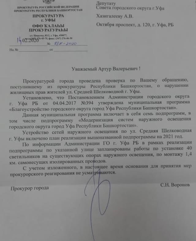 • Январь 2020 года, пишем письмо прокурору РБ, ответ надзорного органа -ждите, вас включили в программу на 2021 год. Дальше интереснее-установят на улице Средней Шелководной, внимание 40 светильников, на существующих опорах !!!!