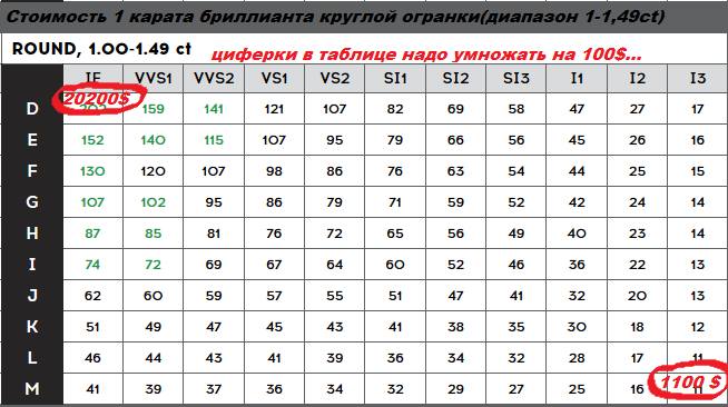 Ведь эту сущую безделицу — 1 КАРАТ (который равен 0,2 грамма) — должен иметь каждый уфимец : согласно таблицам Раппопорта за 2017г один (!) карат бриллианта круглой огранки стоит от 70.000 рублей(совсем мутная дрянь — даже не смотрите) до 1.300.000 рублей (нормально блестит — надо брать!) в зависимости от цветности, чистоты и цельности кристалла ( при диапазоне размера 1-1,49 сt.)