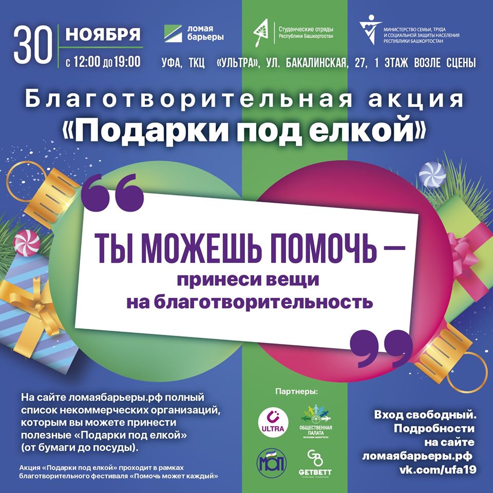 30 ноября в ТРК «Ультра» организуем благотворительную акцию «Подарки под елкой» — это сбор необходимых вещей для 25 благотворительных проектов. Это новогодние подарки, теплые вещи для пожилых, вязаные изделия, ползунки, распашонки для недоношенных, средства гигиены, продукты длительного хранения, наборы для творчества, мячи, скакалки, книги, а также корм, игрушки, лотки для животных и другие «нужности» для ежедневной работы НКО и заботы о подопечных. Полный список ниже.