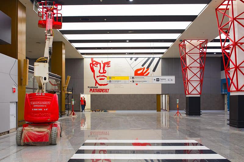 Терминал «B» — это свежее произведение искусства, относящееся к моему любимому периоду: первой трети XX века. Чистый, воплощенный русский авангард, стиль конструктивизм. Ты находишься в супрематизмах Казимира Малевича (это такие прямоугольнички, треугольники и палочки разного цвета, которые как бы крутятся при взгляде на них), в башне Татлина, плакате Александра Дейнеки. Со стены на тебя смотрит Владимир Маяковский. Вместо часов в зале крутится компьютерно-механический «мобиль». Один из залов комфортного обслуживания называется «Кандинский». По полу тебя эргономично направляют широченные чёрно-белые полосы.