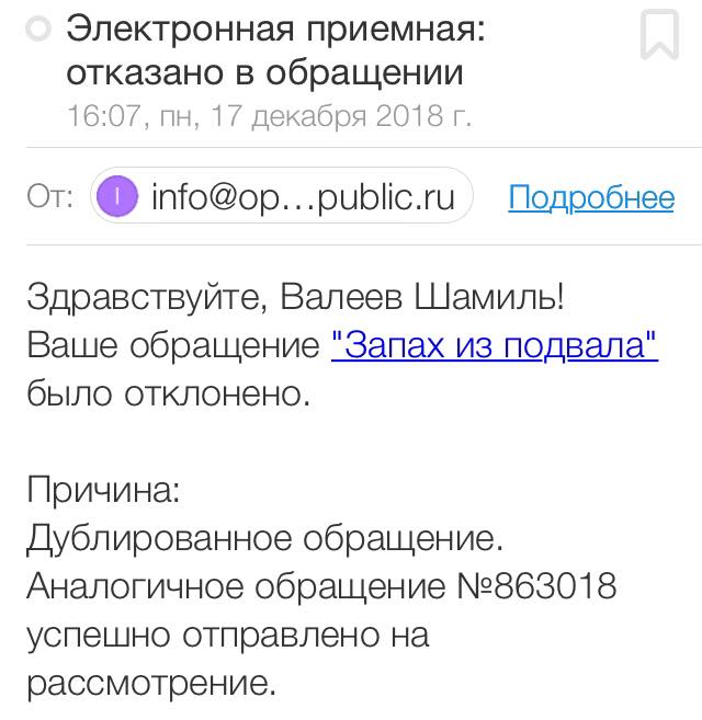 В общем, наслушавшись этой истории с инцидентами, зная Вадима Белякова и сайт «Уфасити», посмел написать «обращение гражданина про проблеме ЖКХ». Мол, воняет на 1 этаже подъезда хуже обычного. От этого портится настроение с утра (прав Радий Фаритович) и цена квадратного метра.