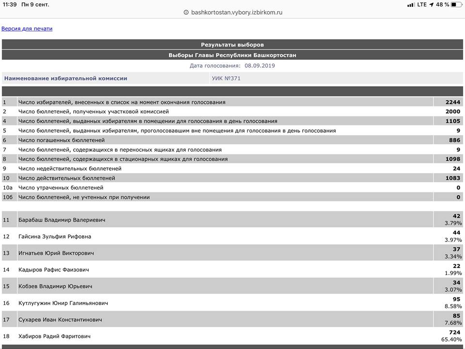 Иллюзий не питал — знаю, как у нас все устроено. Но прошлогодний опыт работы в составе комиссии в УИКе 371, что в уфимском лицее 96, оставлял шанс, что на своём участке я смогу показать «модельный» результат. Годом ранее на выборах в Курултай мы с коллегами показали явку 15,9% и первое место у КПРФ при сравнимом распределении голосов между четырьмя парламентскими партиями. У меня не было сомнений в тех цифрах. И вся комиссия была в приподнятом настроении, давая понять, что им самим нравится работать честно. Ведь среди них был я, присутствием которого они могли легко объяснить отсутствие «нужного результата».