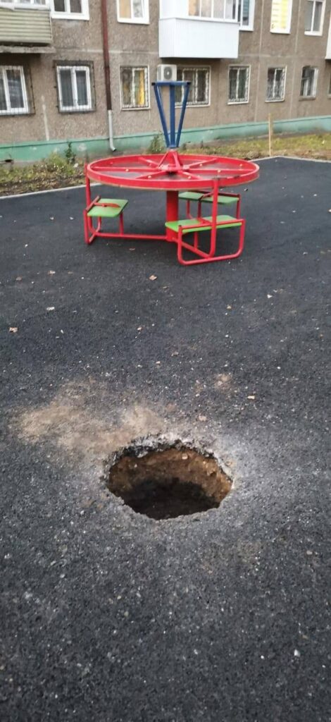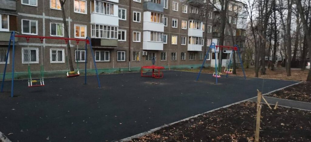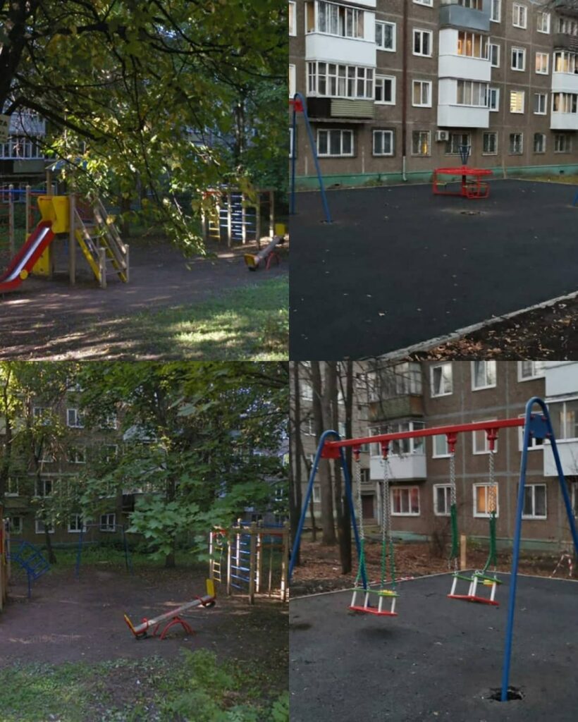 До программы «Башкирские дворики» стояла во дворе ул. Парковая 18/2 функциональная и интересная детская площадка, состоящая из: горки — домика, веревочного спорткомплекса, качалки и качелей, но без безопасного покрытия (ай-я-яй). После программы «БД» «современная детская игровая площадка», как выяснилось, представляет собой две пары качелей в разных углах и карусельку в центре (при этом в асфальт под это закатали аж 153 кв. м.), но зато да — с безопасным покрытием, весёлого чёрного цвета). На этом всё. Совсем всё. Больше ничего на «современной площадке» нет и не будет.Реклама программы «БД» обещала благоустроенные, «как с картинки», дворы с современными, развивающими и интересными для детей детскими площадками, а по факту «а-ля 70-е годы» , в худшем их исполнении. Так и должна работать программа?!