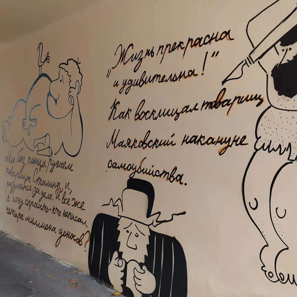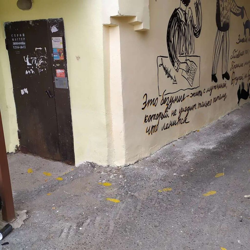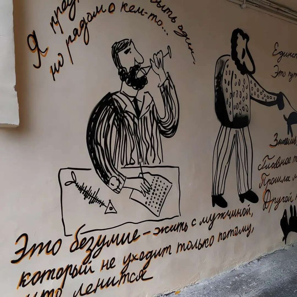Двор к 80-летию великого писателя облагородили и создали там несколько арт-объектов. На фото их видно: это и отрывки из произведений, и иллюстрации из книг, и маленький Сережа Довлатов, которого несет аист. И даже следы маленького Сержа, которые ведут из его подъезда большой мир…