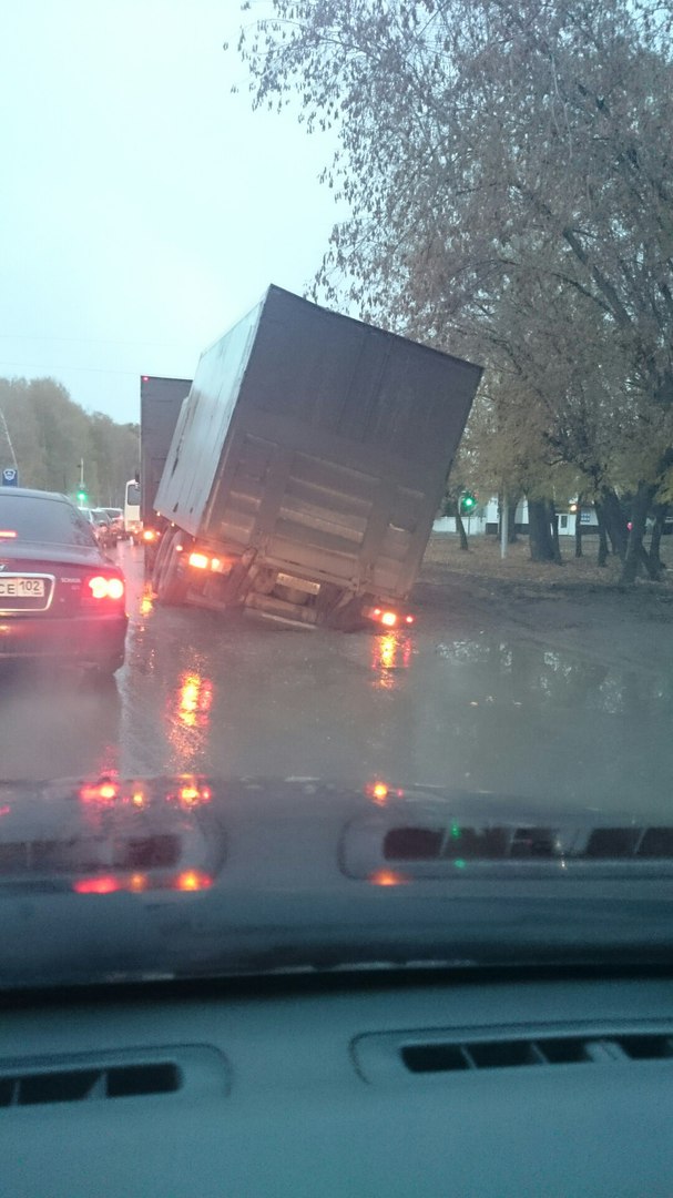 Интернациональная после нахального влево первый светофор, прицеп у фуры провалился во вчерашнюю закопанную яму уфаводоканалом