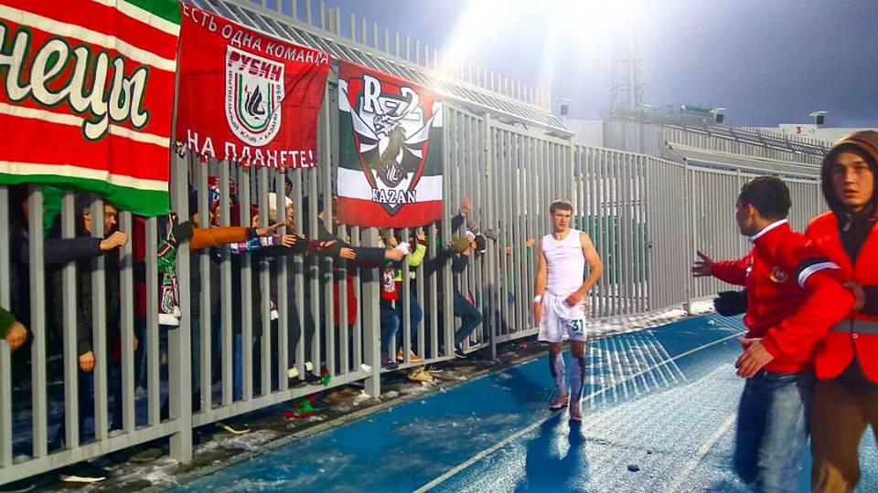 Казанцы после победы над Уфой раздают своим фанатам футболки.