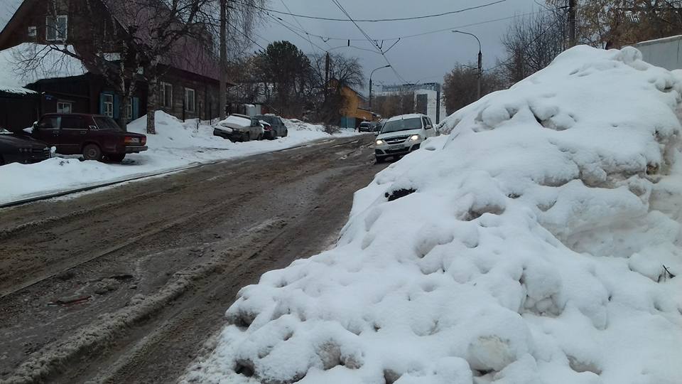 Зимой проезжая часть на улице Сун-ят-Сена перекрывается сугробами на участке протяженностью около двадцати метров, потому что его не чистят зимой вообще.