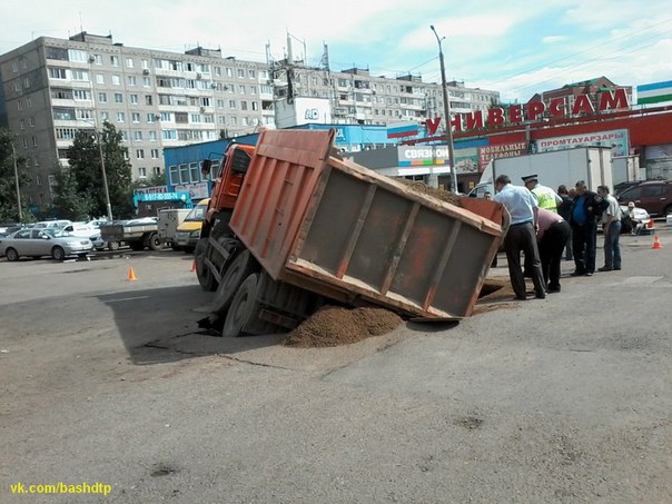 В Уфе груженый КамАЗ провалился сквозь асфальт