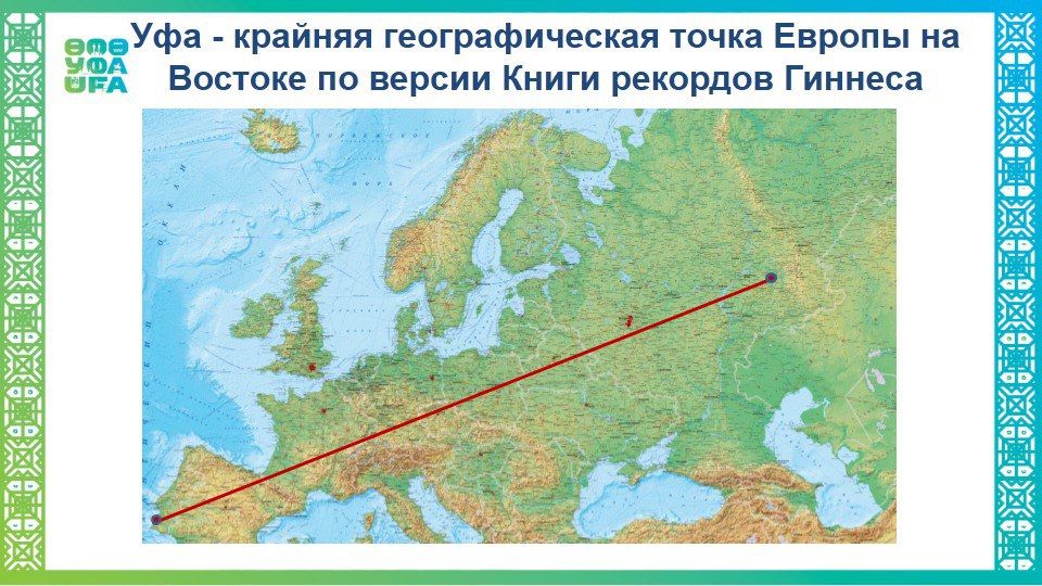 Город Уфа с 2016 года утвержден в Книге рекордов Гиннеса в качестве крайней географической точки Европы