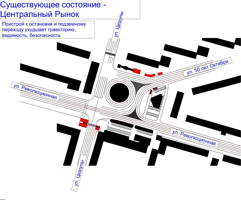 Сейчас достигнуто устойчивое перераспределение полос — 3 по Цюрупы и 3 по Революционной. Однако, остановка общественного транспорта на кольце и вслед за ней тут же примыкание следующей улицы создают пробку из-за смешения потоков, которые к тому же упираются в светофор на кольце.