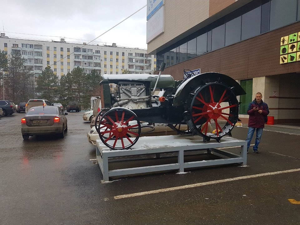 Напомню, что в оформлении этого торгового центра и прилегающей территории мы используем советскую эстетику. Вдохновляемся всем лучшим, что было в то время: рынками союзных республик, статуями в пионерских лагерях и парках, яркими афишами. На каком-то этапе стало понятно, что на территории будет хорошо смотреться еще и трактор 1920-х годов. Вы наверняка представляете, о каком тракторе речь. Тот самый «первый трактор в деревне» из кинохроник и фильмов. Символ богатых колхозов, хорошего урожая и ударного труда.