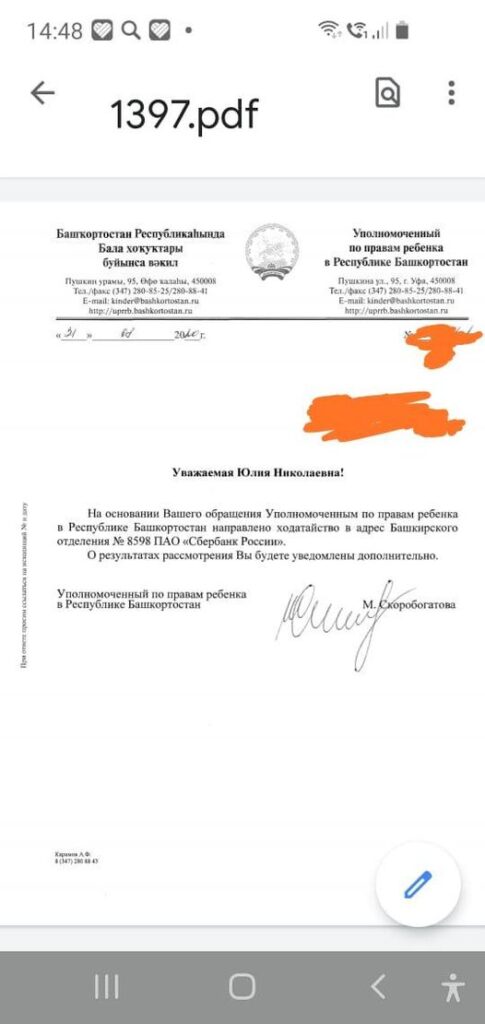 Ранее списанные денежные средства были возвращены Сбербанком на основании ходатайства Уполномоченного по правам ребенка в Республике Башкортостан.