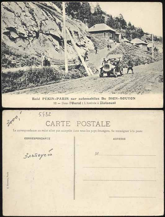 Три автомобиля ехали через Златоуст. Фрагмент почтовой открытки. Машина марки Дион-Бутон застряла в горах Южного Урала: