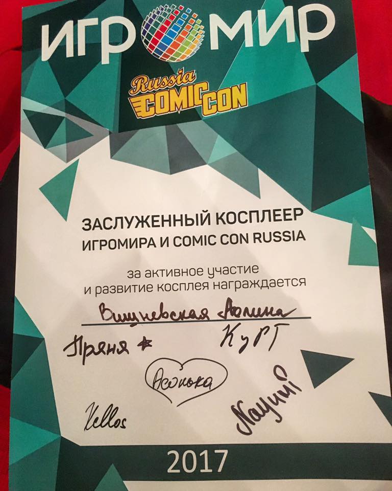 Но самая приятная награда была в виде грамоты от оргов заслуженному косплееру игромира и Comic Con Russia