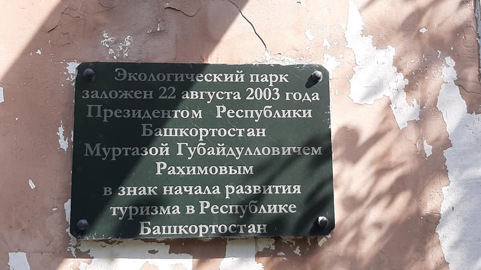 На первом фото вход в экопарк, на втором — крупно висящая на входе табличка, которая гласит, что заложил парк Муртаза Рахимов в 2003 году в знак начала развития туризма в республике.