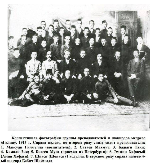 На фотографии представлен Сатаев Махмут, а также шакирд Шайхзада Бабич (— башкирский, татарский поэт и политический деятель. Классик башкирской национальной литературы. Участник башкирского национально-освободительного движения, один из членов Башкирского Правительства (1917—1919). Председатель Всебашкирского союза молодёжи «Тулкын» (1917—1918)).