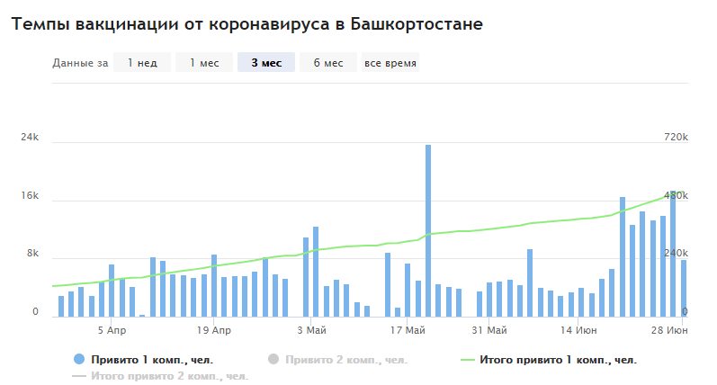Рост темпов вакцинации отмечен по всей стране. Из крупных районов самая хорошая картинка по Башкирии. Похоже на то, что решили больше не возить в республику вакцину из Уфы через Москву, сразу отгрузили с завода.