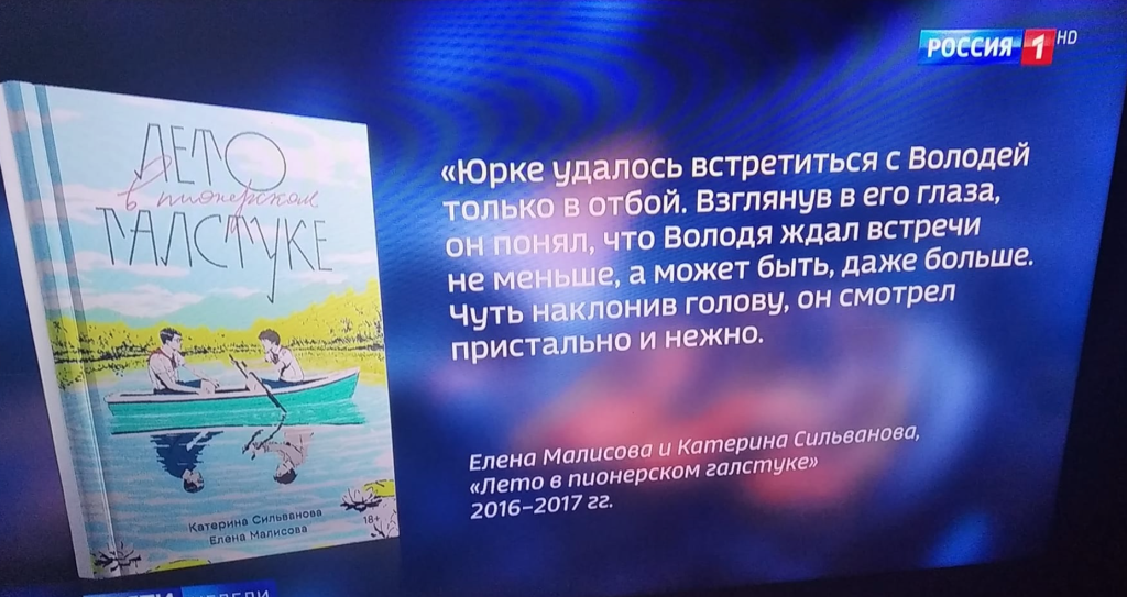 По телеку Киселев рассказывает про вред ЛГБТ и показывает какую-то ужасно вредную книгу.
