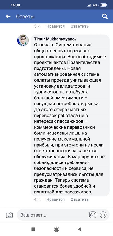 Но вдруг началась реформа, которая призвана решить проблему с той хернёй, которая творилась на маршрутах. Хорошо начали. Но тут, как обычно, нашлись, как их называют за спиной — «студенты». Им в последнее время прилетает от врио Главы. Жили не тужили, а тут чёт движуха какаята. Надо что-то придумать! И вот «студенты» принимают решение установить турникеты в автобусах убыточного БАТ. А давай закупим и установим! Похрену, что остальные уже от них отказались. Чё нам эта Москва? Это наш путь! И делают они это с завидным упорством. Несмотря на возражения горожан, на понятные и вменяемые вопросы, вроде «а нах… зачем собственно они нужны, если вы их всё равно через год демонтируете? Это же очередной распил бюджетных денег». На что Госкомтранс отвечает, смешивая все в кучу, и выдаёт вот такой ответ. Расшифруйте мне эту позицию. Может я действительно не соображаю Не понятна мне и позиция руководства Башкирии, они что, тоже разделяют позицию Госкомтранса?