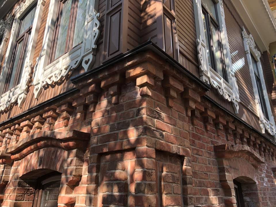 На фото 4 горелый. 5, 6, 7, 8 то, что вышло. По мне так получилось просто невероятно круто. Причем мы сохранили часть старого кирпича и использовали его, а также старые наличники и элементы декора.