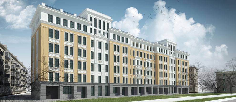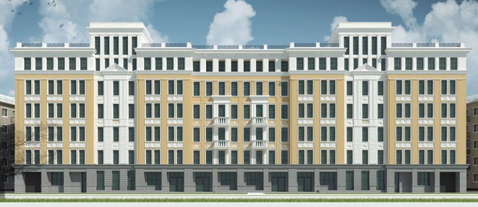 Начиная со 2-го этажа отделка стен меняется на штукатурку. Четыре этажа выкрашены в желтый цвет, а верхний выделен белым цветом. С целью придания зданию более стройного облика, его фасады декорированы вертикальными пилястрами на всю высоту. Фасады украшены декоративными элементами в классическом стиле, портиками и балконами, а так же декоративными розетками с советской символиков, посвященной победе в Великов Отечественной Войне.