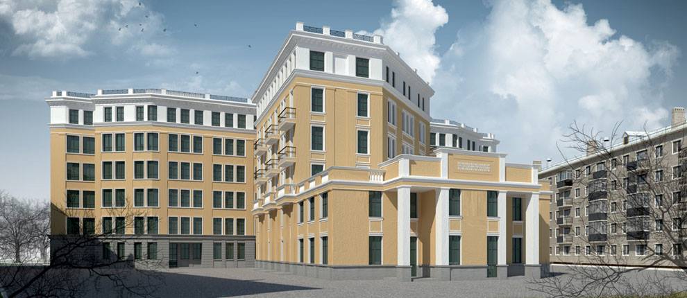 Несущий каркас проектируемого здания выполнен из монолитного железобетона, заполнение стен — керамический кирпич, с утеплением минераловатными плитами. Здание имеет Т-образную форму в плане.