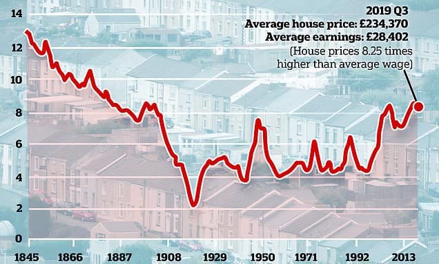 Пик стоимости жилья в пересчёте на средний доход приходился в Британии на 1840-е года: тогда домик для семьи стоил 13 годовых зарплат. Перед началом XX века цена чуть снизилась — до девяти.