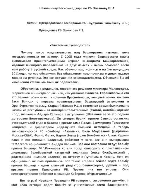 Эту телегу (ещё одно название доноса) накатали, кажется, в 2011 году и направили в разные органы власти, федеральные и региональные. В управление Роскомнадзора РФ по РБ, спикеру парламента Константину Борисовичу Толкачёву, тогдашнему Президенту РБ Рустэму Закиевичу Хамитову.