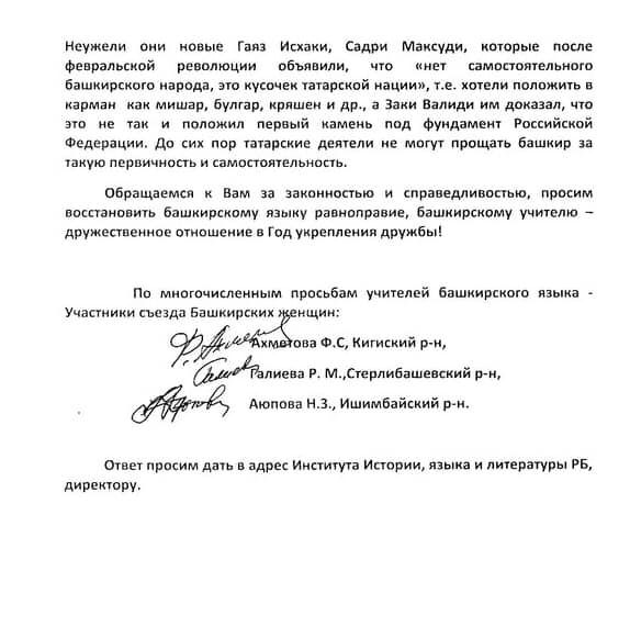 Многие уже и не застали по возрасту и смене цифровой эпохи такой жанр, как донос. (Отец называл его в 80-е «кляуза»). Анонимка. Хотя и подписанная тремя «башкирскими женщинами». Три подписи внизу — это лишь уловка, чтобы обойти правило «анонимки не рассматриваем».