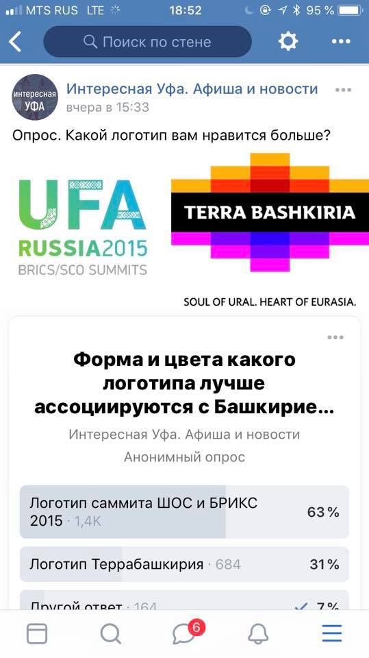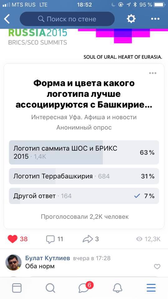 Благо, у Руслана есть отличная стотысячная площадка «ВКонтакте», где можно сделать свой опрос. В итоге порядка 60 процентов за близость к лого саммита и зеленому в айдентике республики, 30 процентов за новое. Всего в опросе приняли участие порядка 2200 человек, практически все — из РБ.