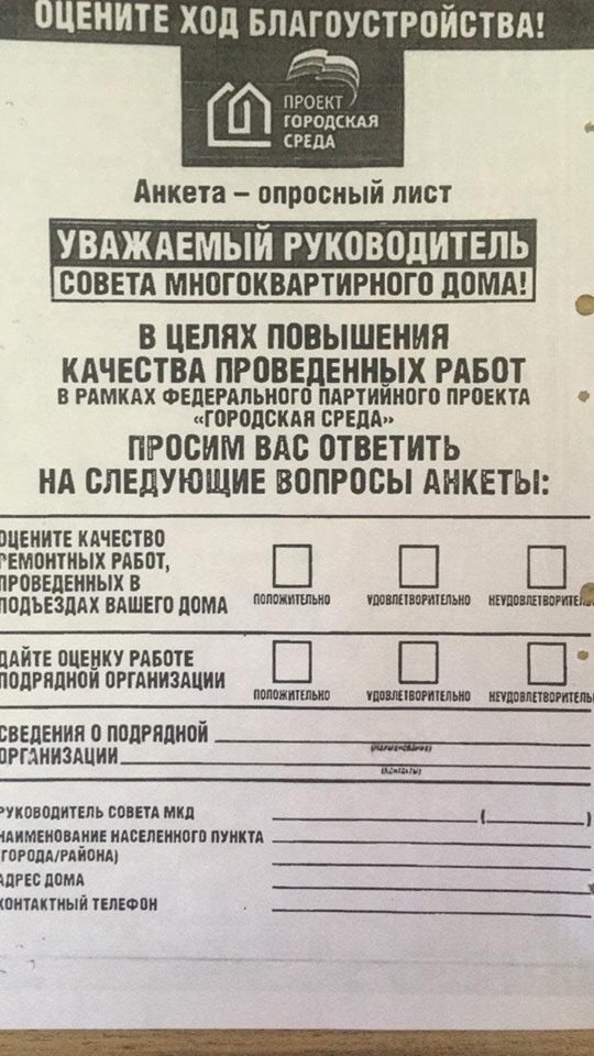 По окончании ремонтов сотрудники УК приносят вот такую анкету, с просьбой оценить качество ремонта.