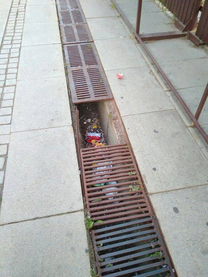 Вот так в некоторых местах выглядит ливневка на Баумана. В ней мусор, она глубокая, в нее легко случайно провалиться ногой и получить неслабые травмы. Почему она открыта и когда ее закроют — я без понятия, но это явный минус.