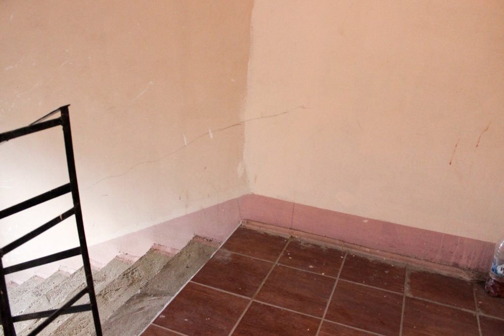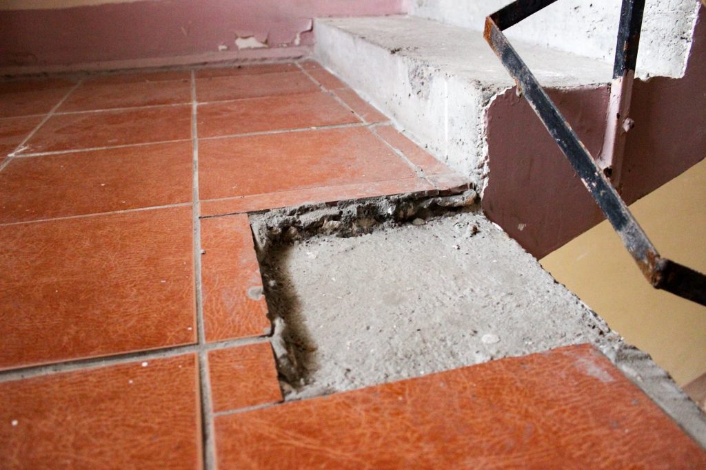 А вот пара слов о строительстве — это лестничная площадка в новом доме. На каждом пролете нет вот такого куска плитки. А всем известно, что если где-то плитка пропала, то на чьей-то даче она появилась.