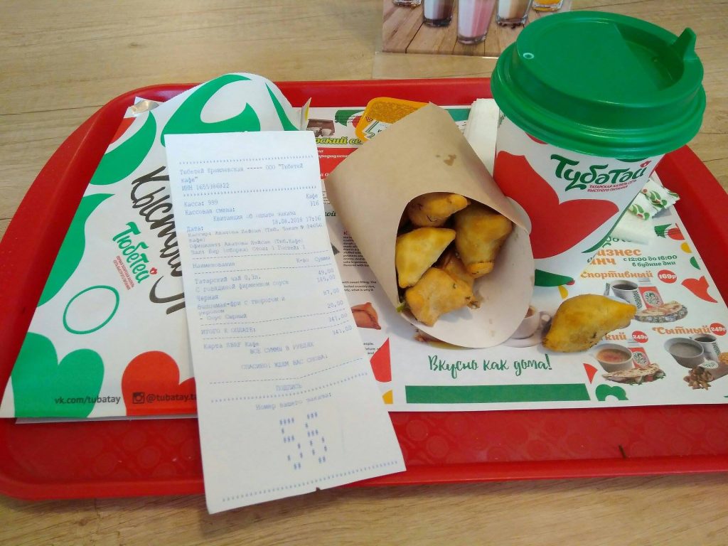 Фирменный фастфуд Казани — Тюбетей. Или Тубетей, плевать короче. Оригинально? Ну, почти. Оформление зала, интерьер, дизайн и все-все-все из этой области понемногу украдено у мастодонтов — бургер кинга, кфс и мака. Вкусно ли? Не особо. Я брал фирменный кыстыбургер за 185 рублей и по вкусу это бургер из мака, только вместо булочки — тесто для кыстыбый. Эчпочмак фри — небольшие пирожочки, внутри которых творог с зеленью, на любителя, начинки самый минимум, не успеваешь распробовать. Ну и сырный соус — обычный Хайнц.