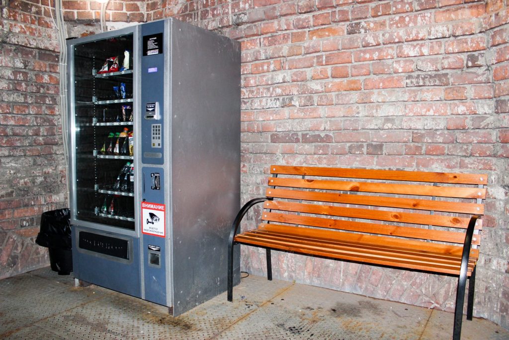 Колокольня богоявленского собора. На полпути к смотровой площадке стоит скамейка и автомат со сникерсами. Как-то… неправославненько, не?