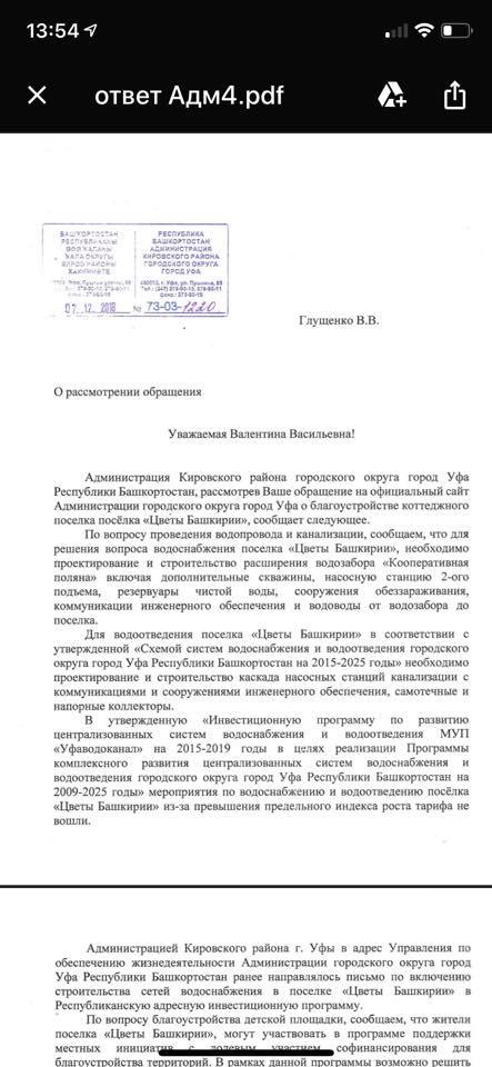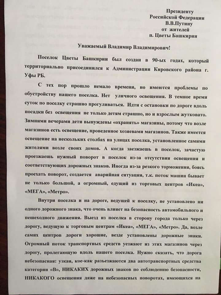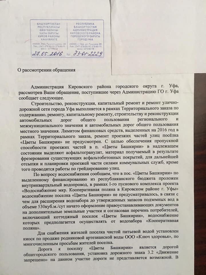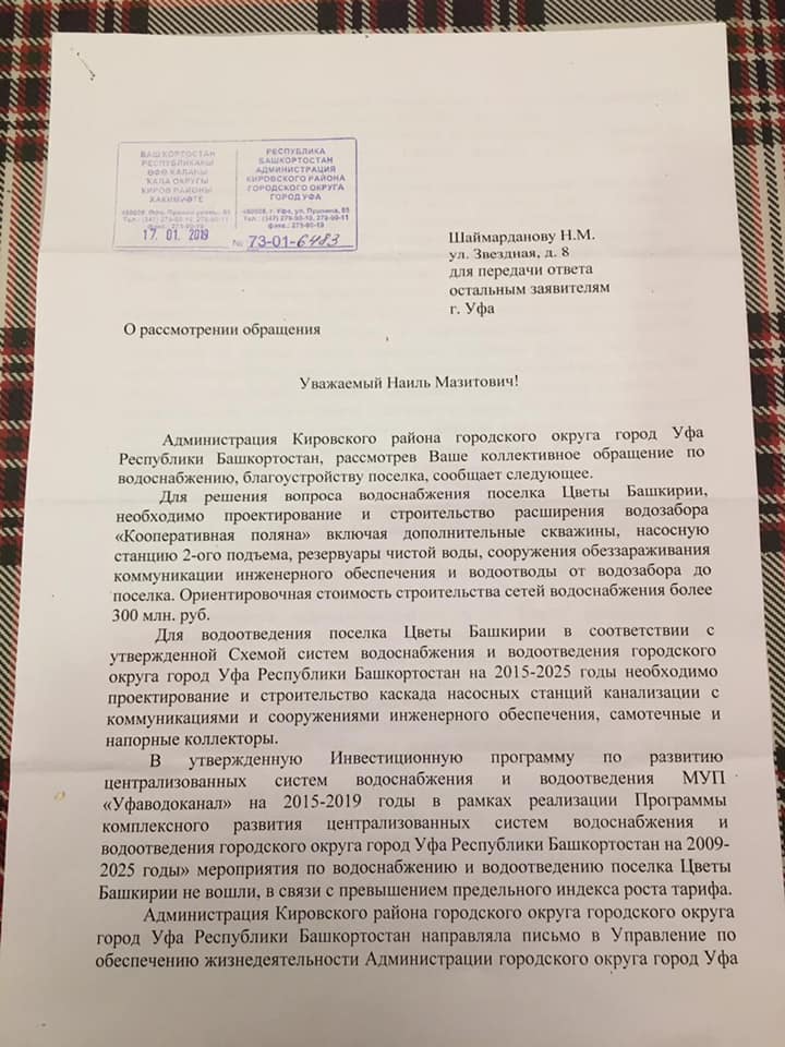 Раньше Цветы Башкирии в состав г. Уфы не входили. У нас была своя дирекция. Которая насобирала денег на централизованный водопровод и ещё на кучу всего и смылась в неизвестном направлении. Разве люди тут живут? Нет конечно! Тогда зачем им вода?!