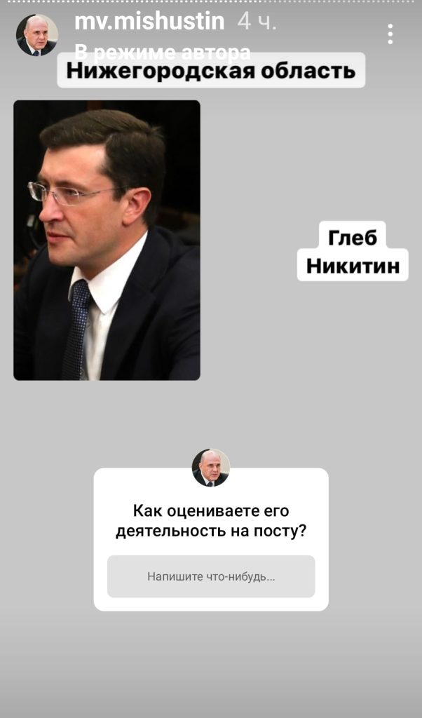 Я же сейчас усиливаю свои компетенции в ведении инстаграма. Поэтому смотрю на то, как делают другие, более внимательно. Несомненно, у премьер-министра или его фантома — самые лучшие специалисты. Сегодня там в сториз опрос о деятельности губернаторов (почти всех регионов, много сториз, не долистала). Мне кажется, что здесь логично было бы поставить опрос с выбором готового варианта ( + или -) — хороший соцопрос по выяснению настроений получился бы))). Но предпочли открытый вопрос, при ответе на который надо подумать и сформулировать мысль. Ну и кто захочет писать