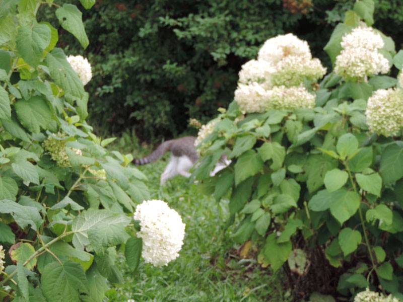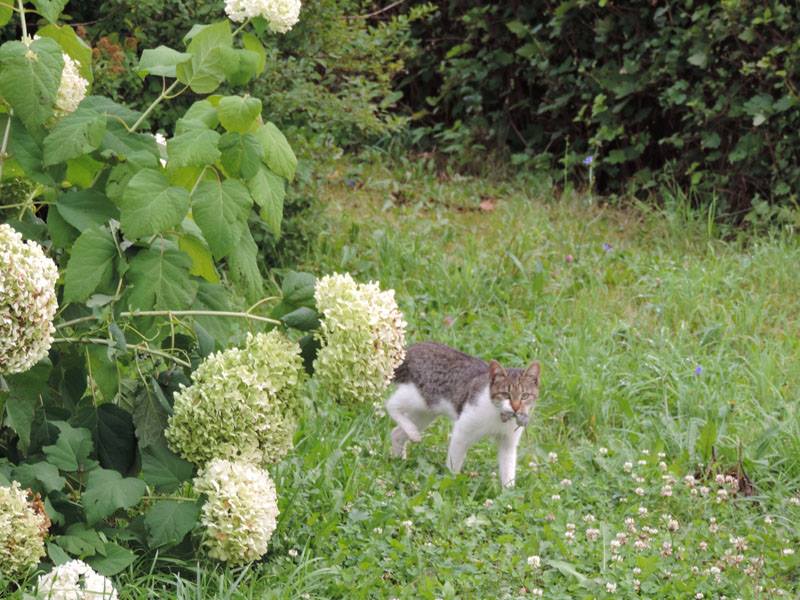 Пушистое существо промелькнуло среди роскошных гортензий… Кто это? А вот и оно! Увидев меня, застыло как вкопанное. Почувствовав с моей стороны опасность, симпатичная хищница бросилась наутёк, сжимая в зубах хвостатую добычу.