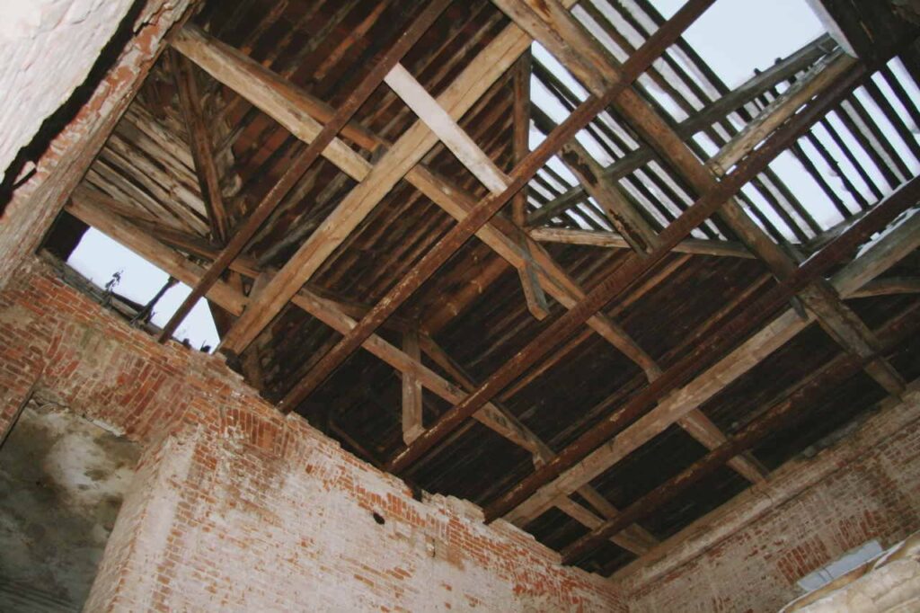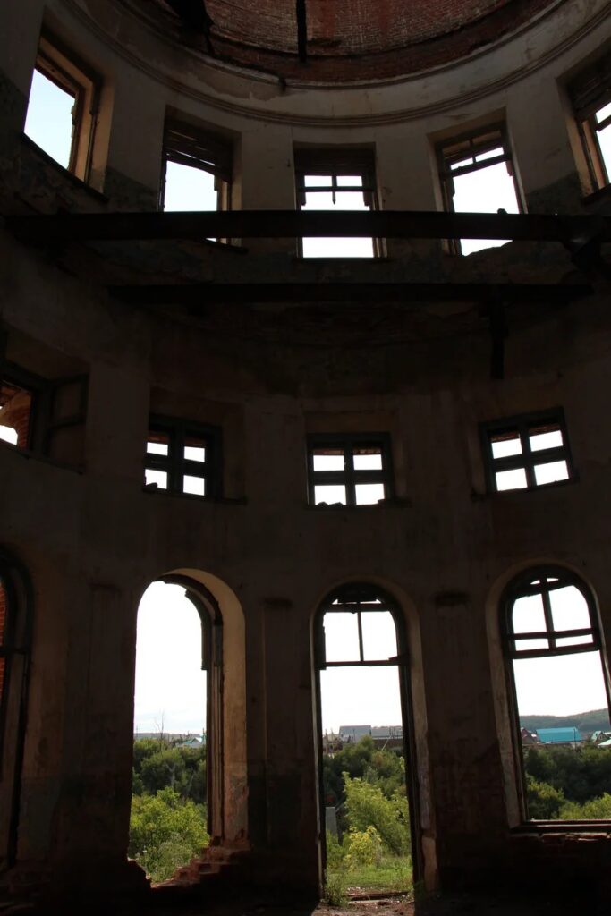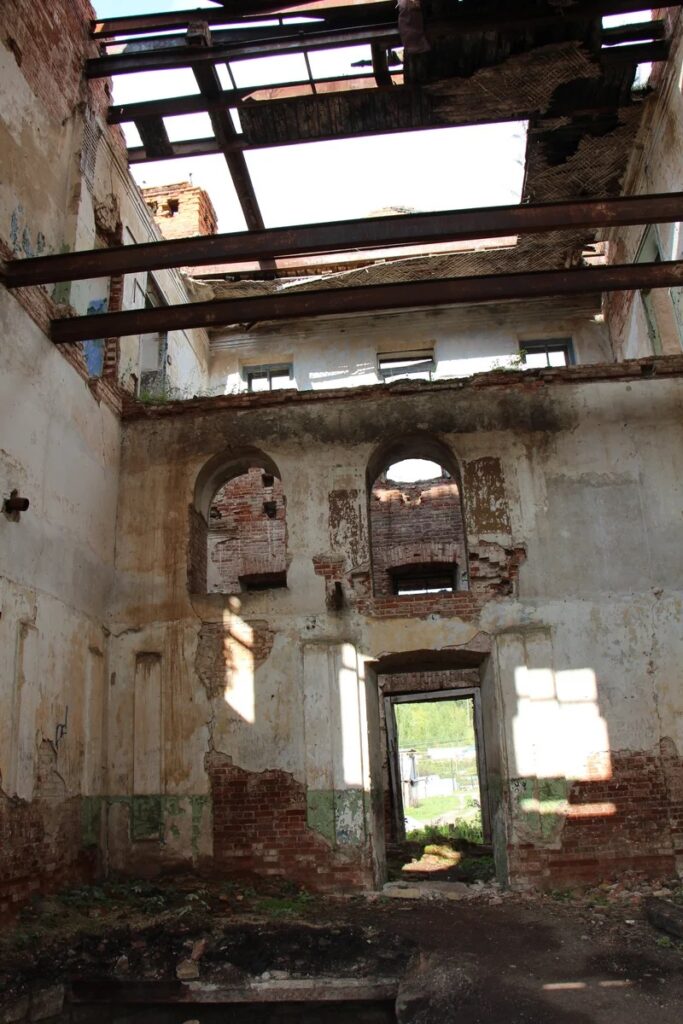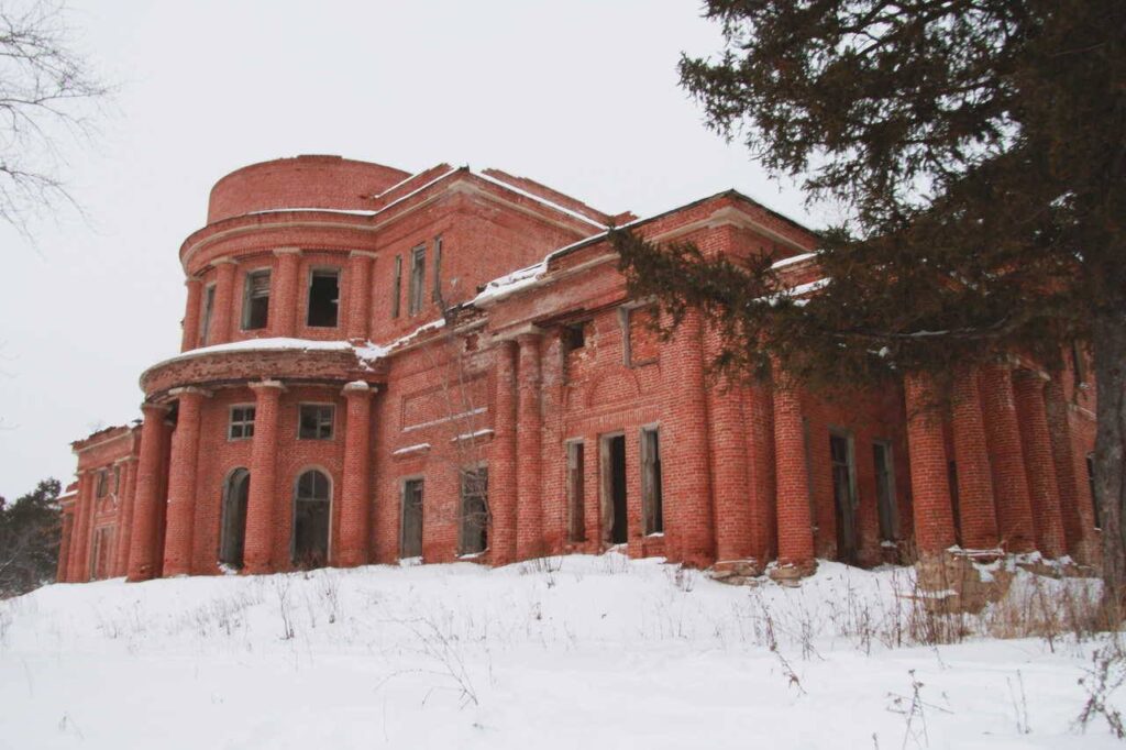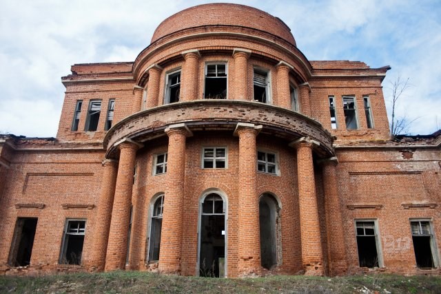 Само здание трехэтажное, на первом этаже, судя по всему, был зал для балов с балконами. Внутри мало что уцелело, только голые стены, и местами остатки лепнины. Крыши почти не осталось. Но это скорее не от старости, а просто люди поломали. Так как кладка здания капитальная и стоять она ещё будет долго.