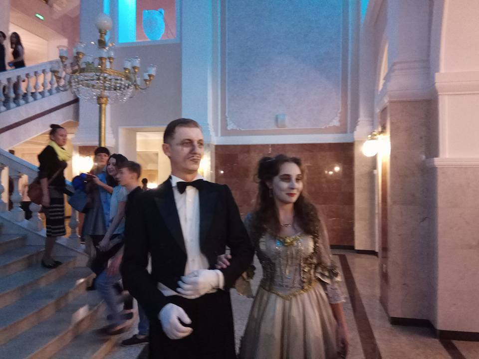 Мы на опере. Уже все жутко нравится — и таинственная подсветка в холлах, и зомби из 19-го века, гуляющие по театру.